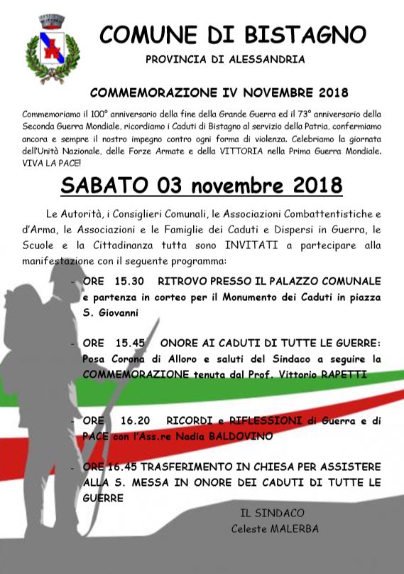 Commemoriamo il 100° anniversario della fine della Grande Guerra ed il 73° anniversario della Seconda Guerra Mondiale, ricordiamo i Caduti di Bistagno al servizio della Patria, confermiamo ancora e sempre il nostro impegno contro ogni forma di violenza. Celebriamo la giornata dell’Unità Nazionale, delle Forze Armate e della VITTORIA nella Prima Guerra Mondiale. VIVA LA PACE!